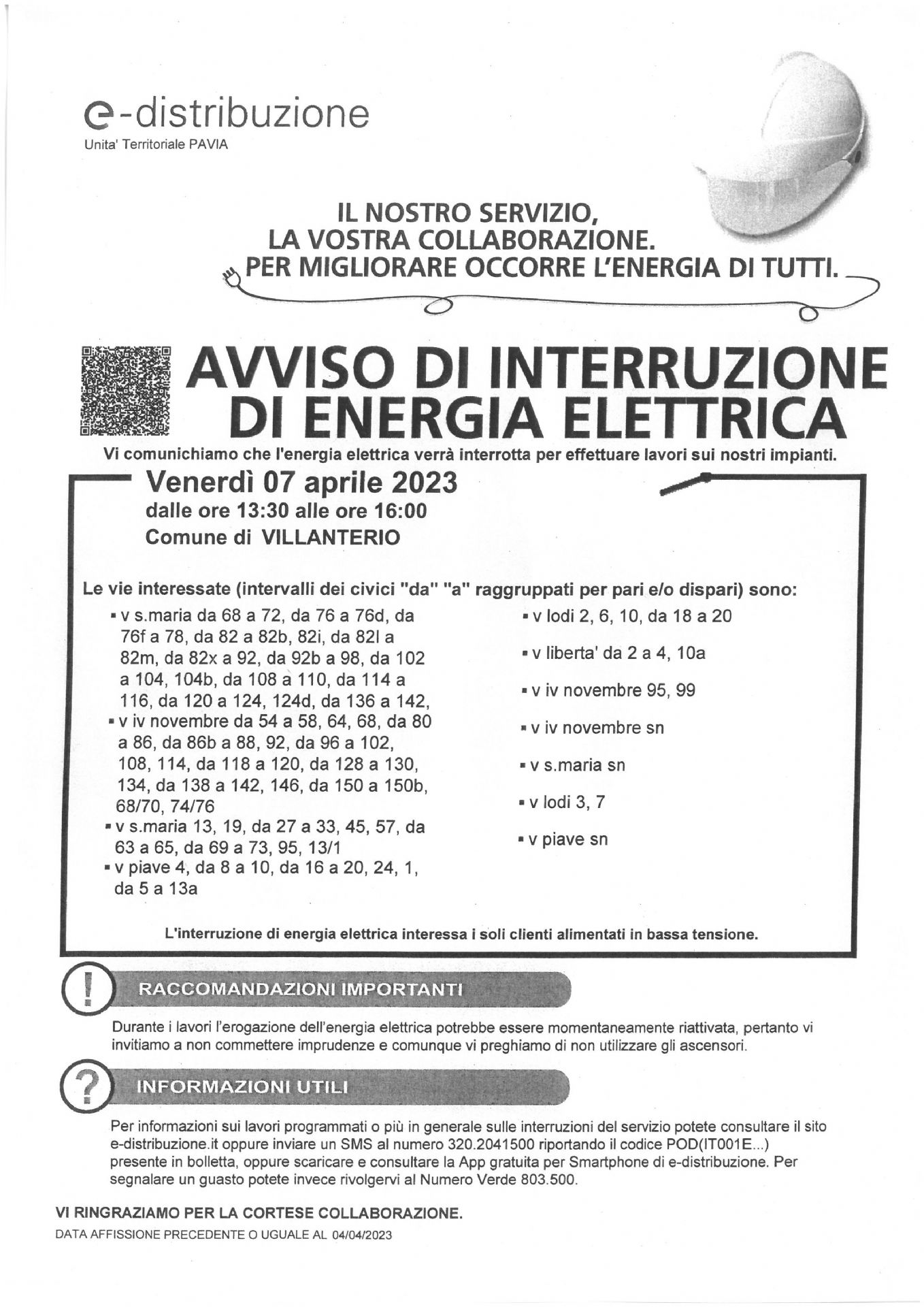 VENERDI' 7 APRILE 2023 DALLE 13:30 ALLE 16:00 IN ALCUNE VIE DEL PAESE L'ENERGIA ELETTRICA VERRA' INTERROTTA PER LAVORI SUGLI IMPIANTI