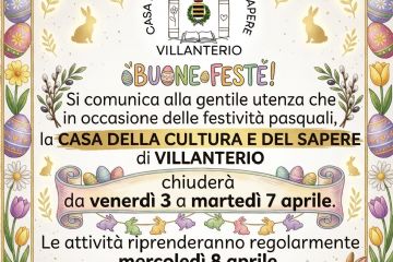 Si comunica alla gentile utenza che in occasione delle festività pasquali , la Casa della Cultura e del sapere di Villanterio chiuderà da venerdì...