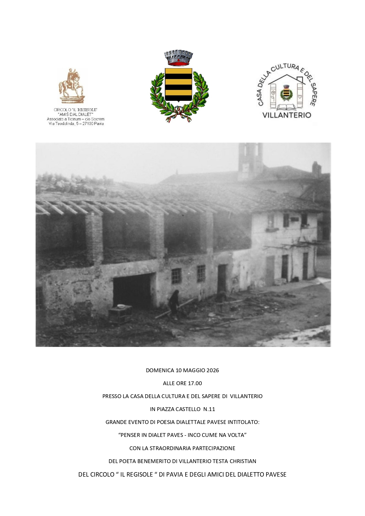 Grande evento di poesia dialettale pavese intitolato: “Penser in dialet paves - inco cume na volta” con la straordinaria partecipazione del poeta benemerito di Villanterio Testa Christian del circolo “ il Regisole “ di Pavia e degli amici del dialetto pavese